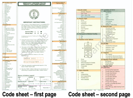Police officers use a two-page code sheet with instructions to help them prepare each Kentucky Uniform Police Traffic Collision Report.