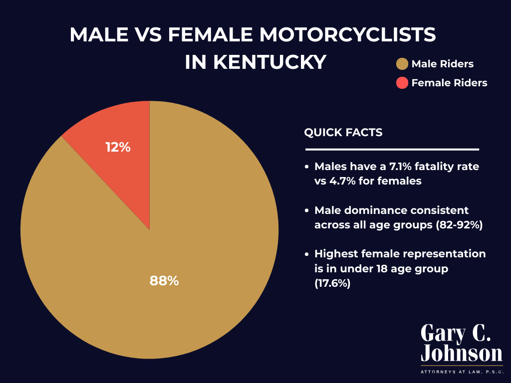During our research, we found a large disparity between male and female motorcyclists in Kentucky. According to the data, motorcycle crashes overwhelmingly involve male riders, making up nearly 88% of the crash data. There are significantly less female riders in Kentucky, therefore explaining the fewer fatality rate for female drivers. We also found: