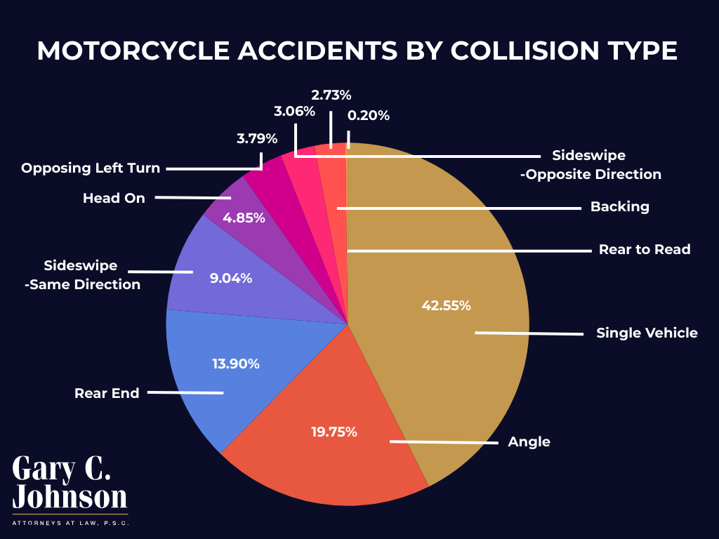 In 2025, most motorcycle accident fatalities in Kentucky were due to single-vehicle crashes (39.64%, 44 deaths), followed by angle collisions (22.52%, 25 deaths) and head on collisions (12.61%, 14 deaths). Other notable causes included rear ends (10.81%, 12 deaths) and opposing left turn (7.21%, 8 deaths).